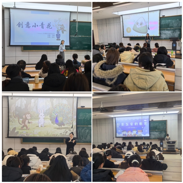 活动由何妍同学主持。张苗、张蕊蕊的《月亮姑娘做衣裳》拉开了展演序幕;李蕊娟、崔蕊的《蛋糕失窃案》展现了科学探究趣味;殷敏、杨馨怡的《小小粉刷匠》融合弹唱与律动,活跃了现场气氛;王新燕、胡彤、李思思、李娜分别通过《探索五官的秘密》《美食王国大挑战》《小壁虎借尾巴》《创意小青花》等课例,展示了教具运用、活动设计及语言与艺术教学魅力。