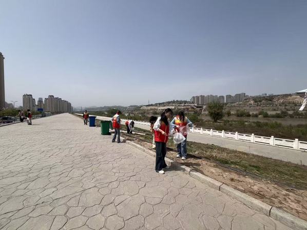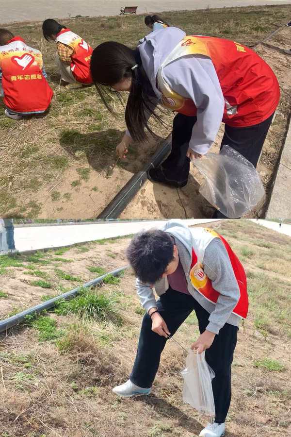 活动现场,志愿者们身着统一红马甲,手持垃圾钳、分类垃圾袋等工具,在负责老师的统筹下分组行动。大家沿着黄河滩涂展开拉网式清理,弯腰捡拾散落在草丛、石缝中的塑料瓶、烟头、食品包装袋等垃圾,细致排查每一处卫生死角,默契配合完成垃圾收集与分类转运。经过3小时的辛勤劳作,累计清理各类垃圾20余袋,让原本散落杂物的河岸焕然一新,清澈河水与整洁岸线相映成景。